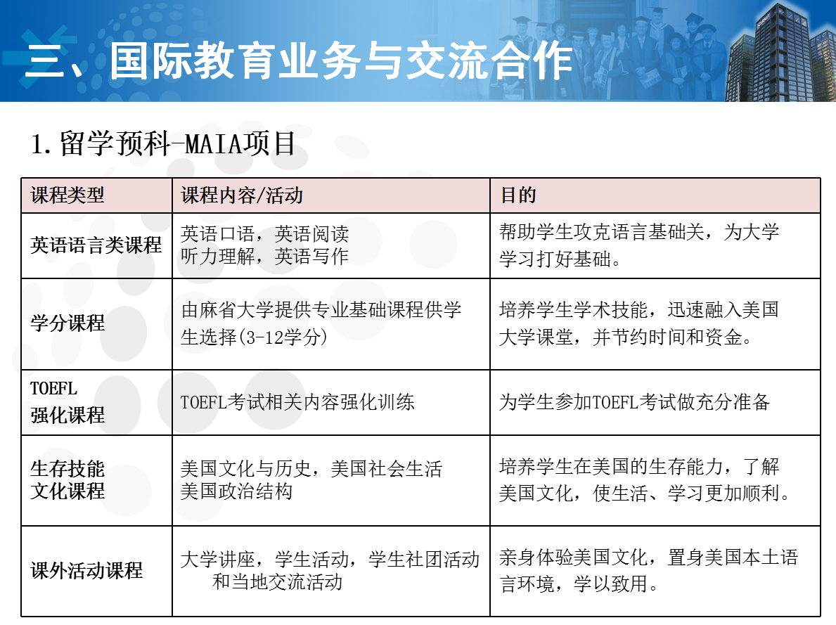 初、高中、大学生(即将毕业和毕业)中上成绩经过短期培训或直接推荐进入美国麻省大学、韩国、泰国、日本专、本科和研究生深造学习